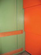 Bei der Modernisierung von Warenaufzügen mit handbetätigten Flügeldrehtüren fehlt oft der Platz im Schacht für die Nachrüstung einer horizontal bewegten Kabinenabschlusstüre. Für diesen Fall haben wir eine 3-teilige, nach oben öffnende Vertikalschiebetüre entwickelt. Sie wird nur noch bei Sanierungen eingesetzt.