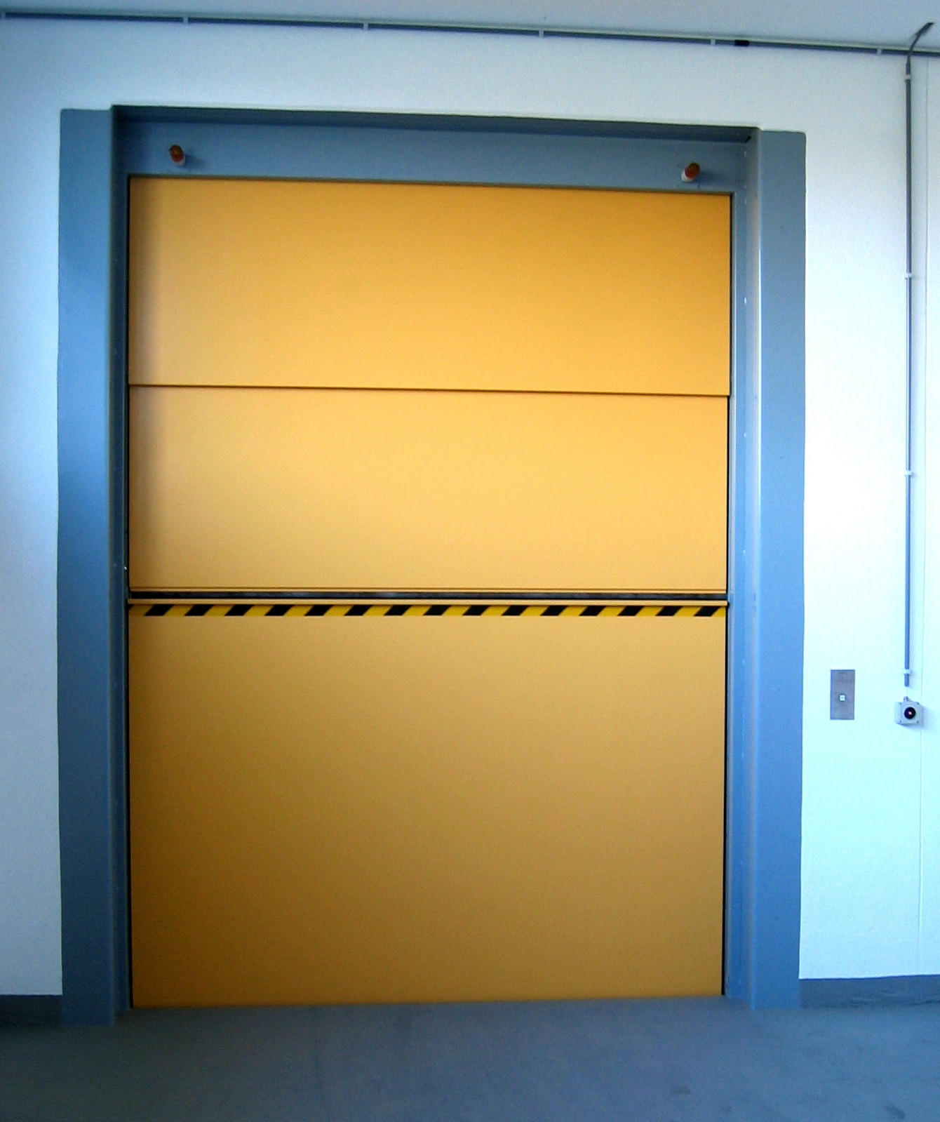 Für Schächte mit geringen Haltestellenabständen und hohen Türen haben wir 3-teilige Vertikalschiebetüren entwickelt. 2/4 der Türhöhe öffnet sich nach oben, 1/2 nach unten.